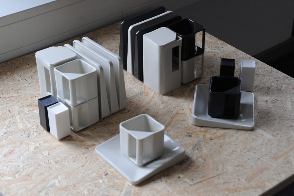 firstly, the plates can be placed vertically in a row and secondly, all the components have the shape of a square and can hence be stacked easily. which is constituting the main goal of my design, because unlike conventional round kitchen utensils, these are able to fill all the corners of a cabinet, ensuring a more efficient use of space. Thirdly, due to the precisely matched dimensions, the plates, cups and