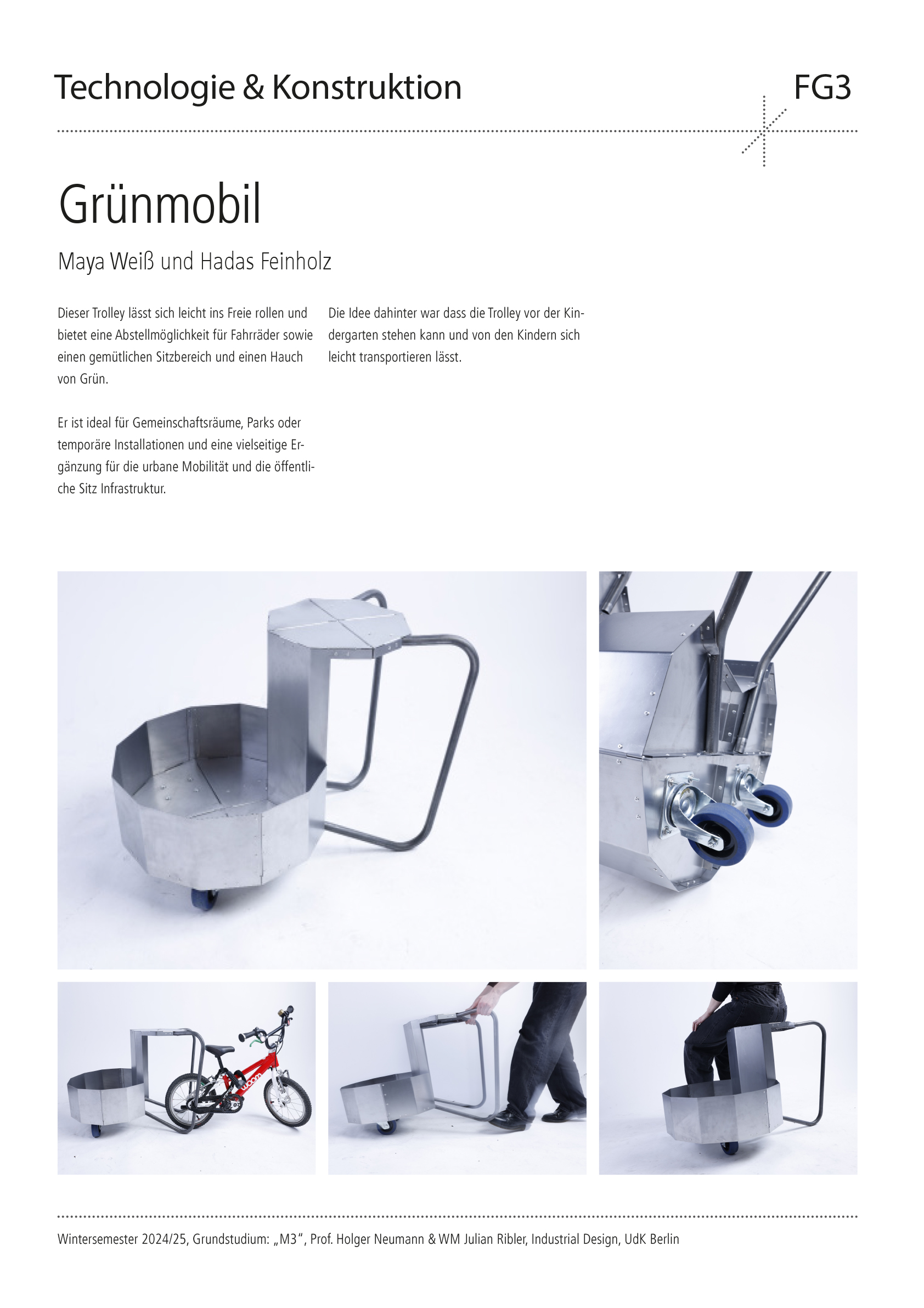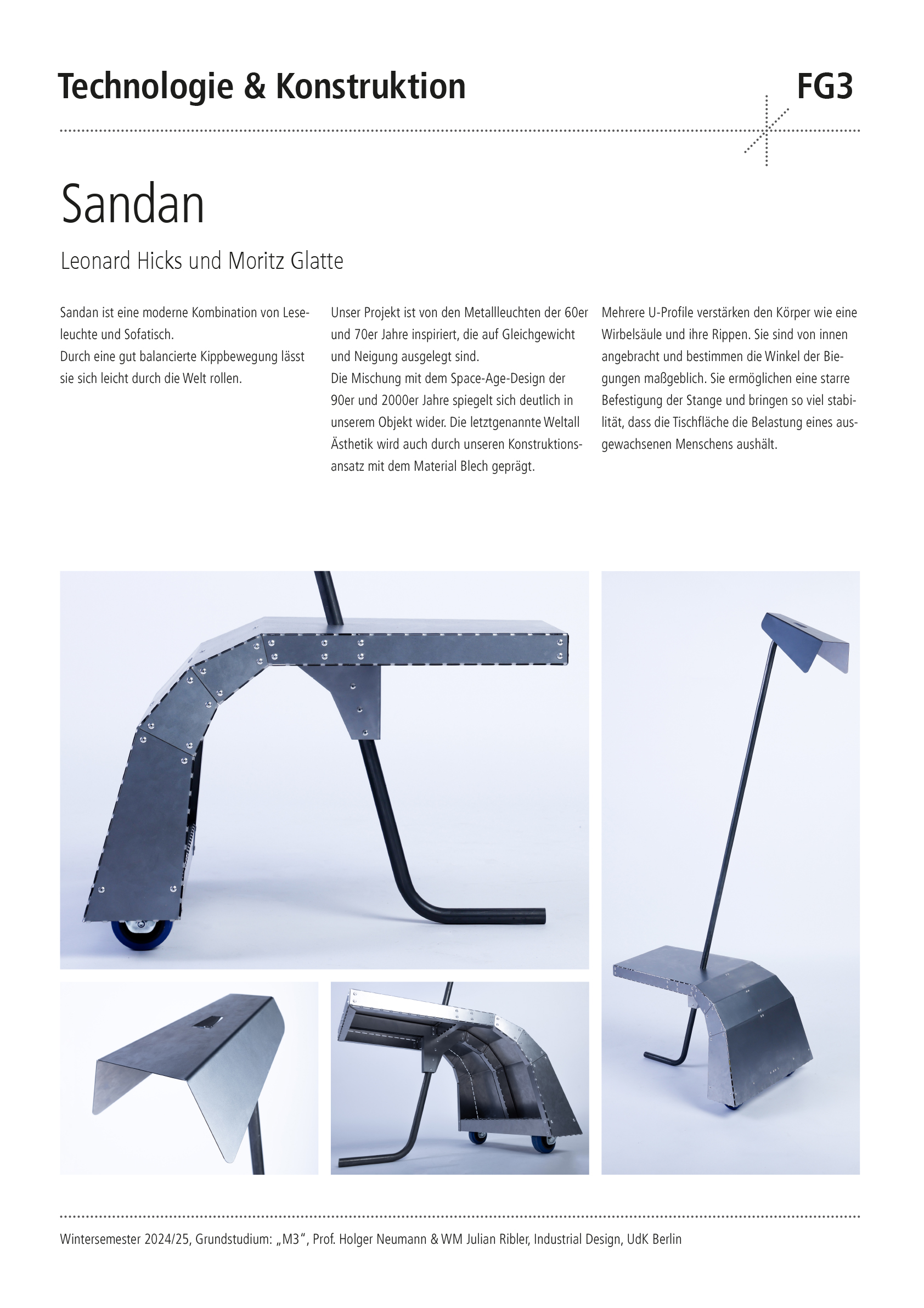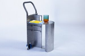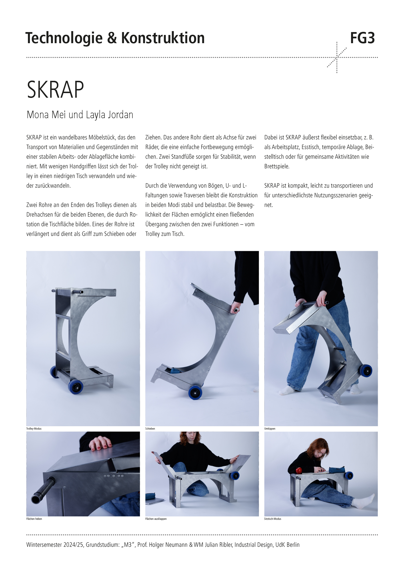 Entwerfe aus 1 m2 Stahlblech der Stärke 1 mm und 2 m Stahlrundrohr ein Metallmöbel auf 2 Rollen, das gekippt werden kann. Die Funktion und Typologie werden bewusst offen gehalten: Inspirationsquellen können sein: Werkstattwagen, Sackkarren, Kompakte bewegliche Arbeitsplätze (Sekretär), Küchenutensilo, Sitz/Steh-Hilfe, Überraschendes, Neu-Kombiniertes…etc.. Der Prozess des Kippens kann (aber muss nicht) thematisiert werden, z.B. um zwischen 2 Zuständen zu wechseln oder unterschiedliche Typologien und Funktionen zu ermöglichen. Das Rohr (2 m Halbzoll) und die Rollen sind vorgegeben. Die Herausforderung der Aufgabe besteht darin, mit sehr reduzierten Mitteln und innerhalb von Beschränkungen (sog. Design Constraints) ein sehr kreatives, funktionelles und insbesondere herstellbares Objekt zu entwerfen, zu konstruieren (solidworks sheet metal modul) und zu fertigen. Besonderes Augenmerk wird auf einen effizienten Materialeinsatz sowie eine dem Prozess und dem Material angemessene Formensprache gelegt. Gemeint ist damit eine konstruktive Eleganz, die sich aus dem optimalen Zusammenspiel von Statik, Konstruktion und gestalterischer Qualität ergibt.