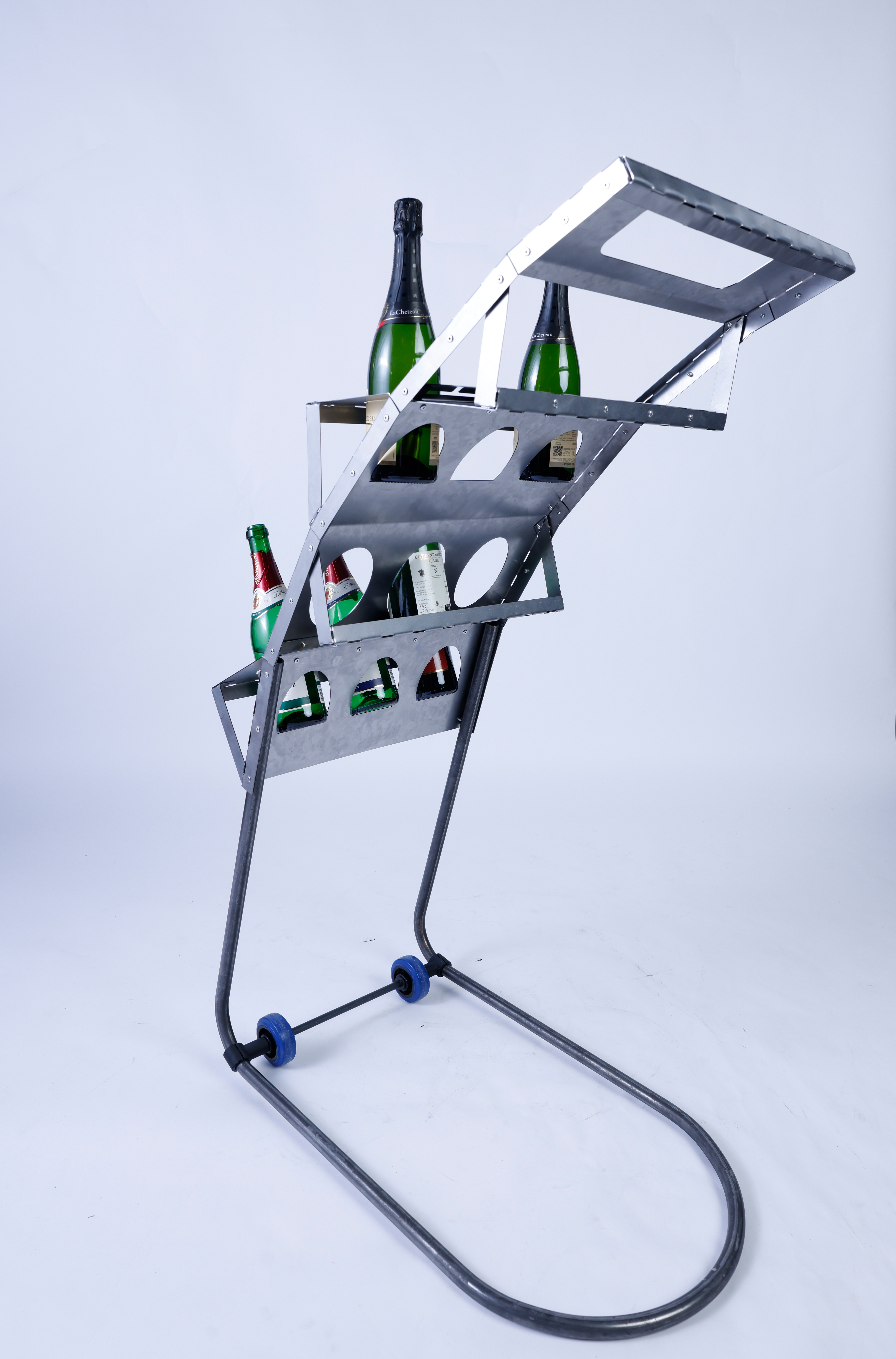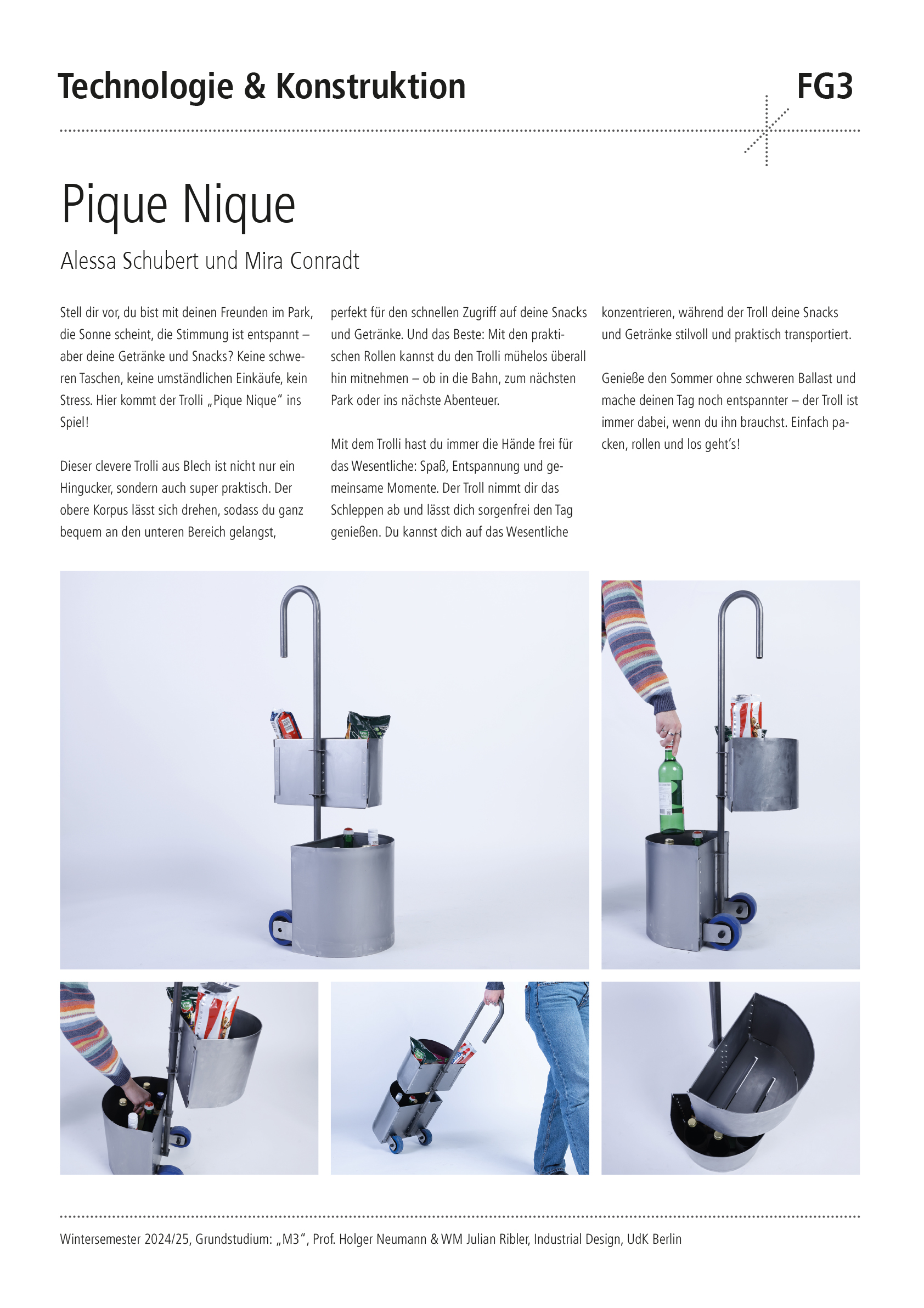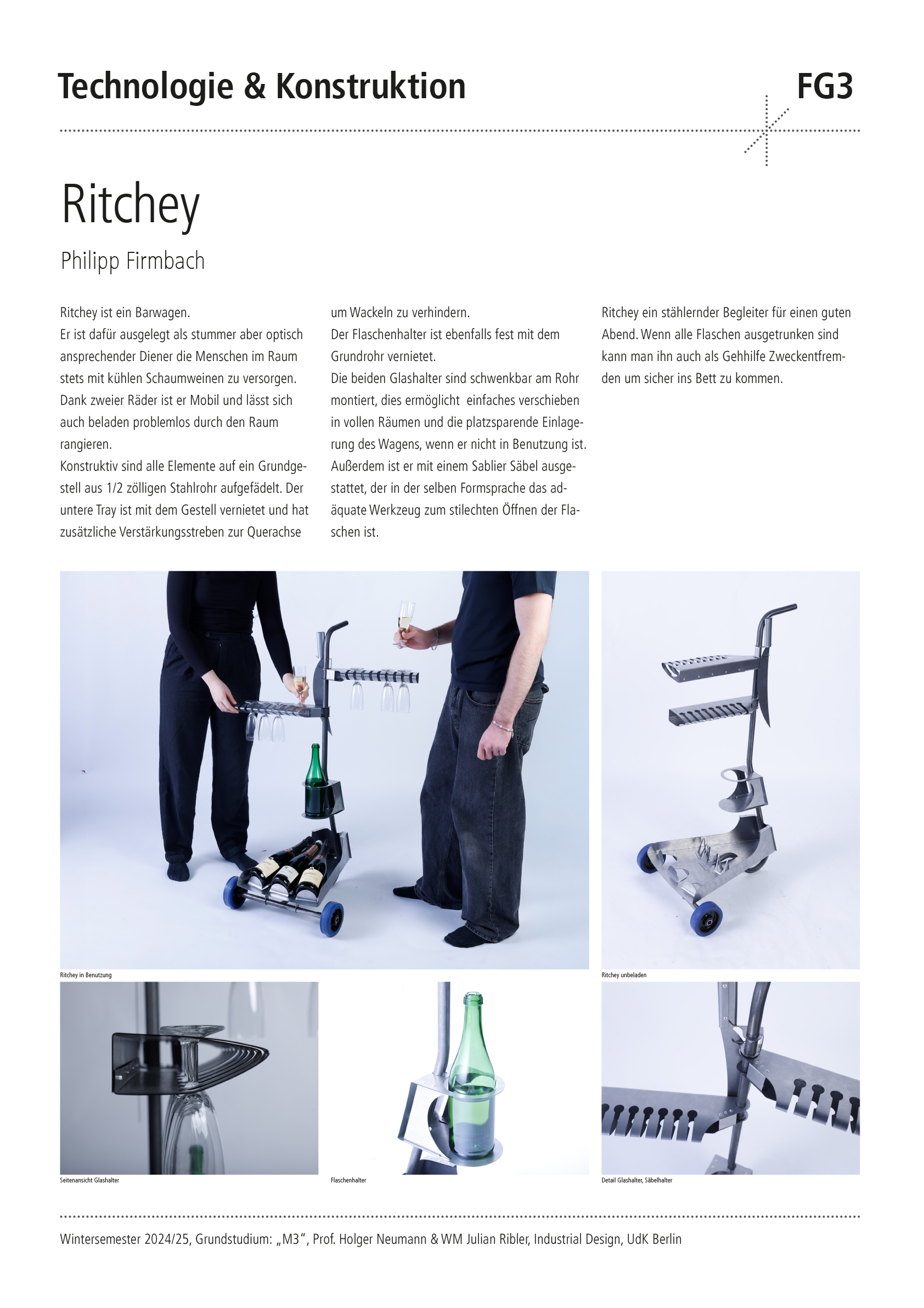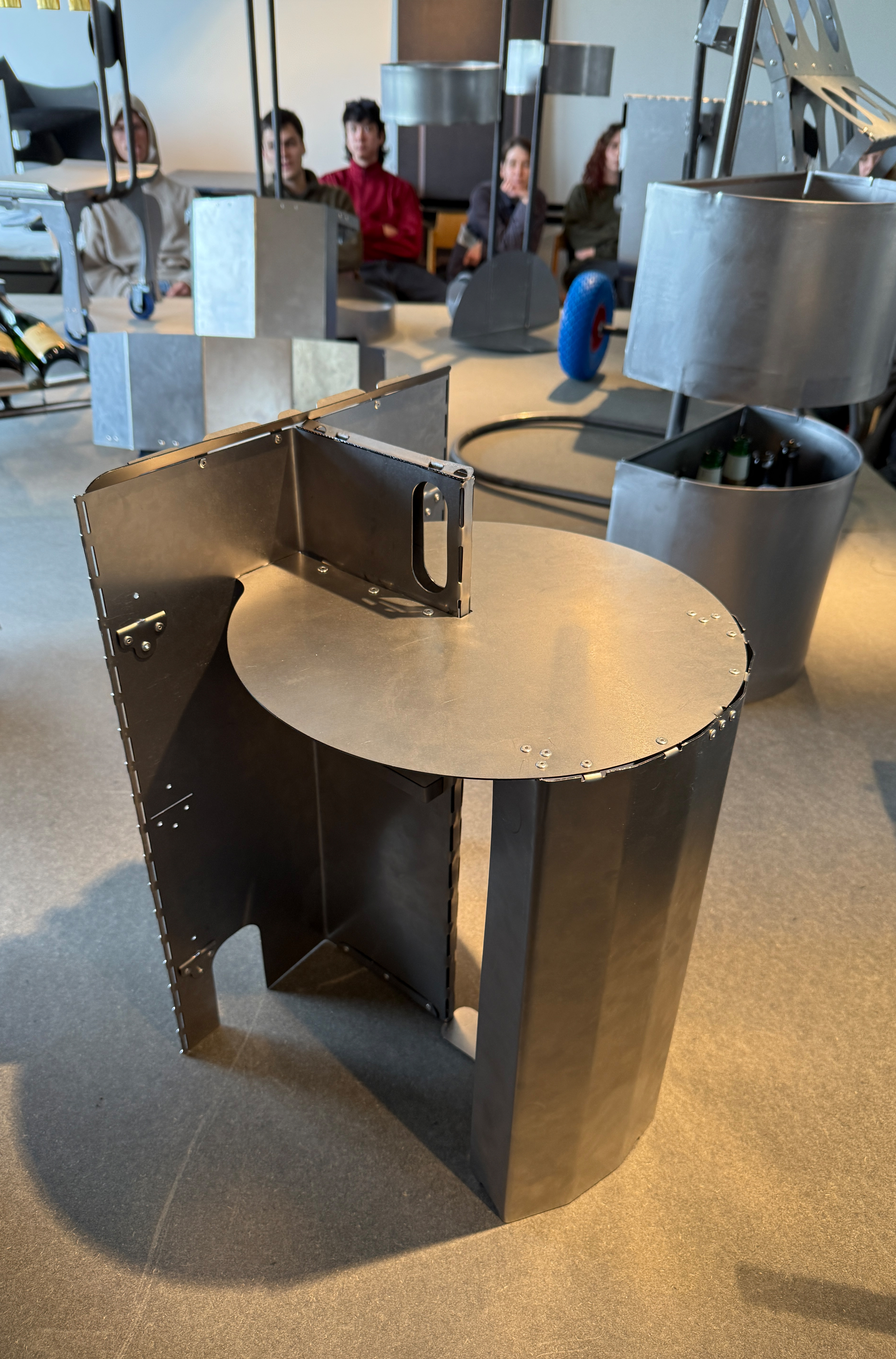 Entwerfe aus 1 m2 Stahlblech der Stärke 1 mm und 2 m Stahlrundrohr ein Metallmöbel auf 2 Rollen, das gekippt werden kann. Die Funktion und Typologie werden bewusst offen gehalten: Inspirationsquellen können sein: Werkstattwagen, Sackkarren, Kompakte bewegliche Arbeitsplätze (Sekretär), Küchenutensilo, Sitz/Steh-Hilfe, Überraschendes, Neu-Kombiniertes…etc.. Der Prozess des Kippens kann (aber muss nicht) thematisiert werden, z.B. um zwischen 2 Zuständen zu wechseln oder unterschiedliche Typologien und Funktionen zu ermöglichen. Das Rohr (2 m Halbzoll) und die Rollen sind vorgegeben. Die Herausforderung der Aufgabe besteht darin, mit sehr reduzierten Mitteln und innerhalb von Beschränkungen (sog. Design Constraints) ein sehr kreatives, funktionelles und insbesondere herstellbares Objekt zu entwerfen, zu konstruieren (solidworks sheet metal modul) und zu fertigen. Besonderes Augenmerk wird auf einen effizienten Materialeinsatz sowie eine dem Prozess und dem Material angemessene Formensprache gelegt. Gemeint ist damit eine konstruktive Eleganz, die sich aus dem optimalen Zusammenspiel von Statik, Konstruktion und gestalterischer Qualität ergibt.