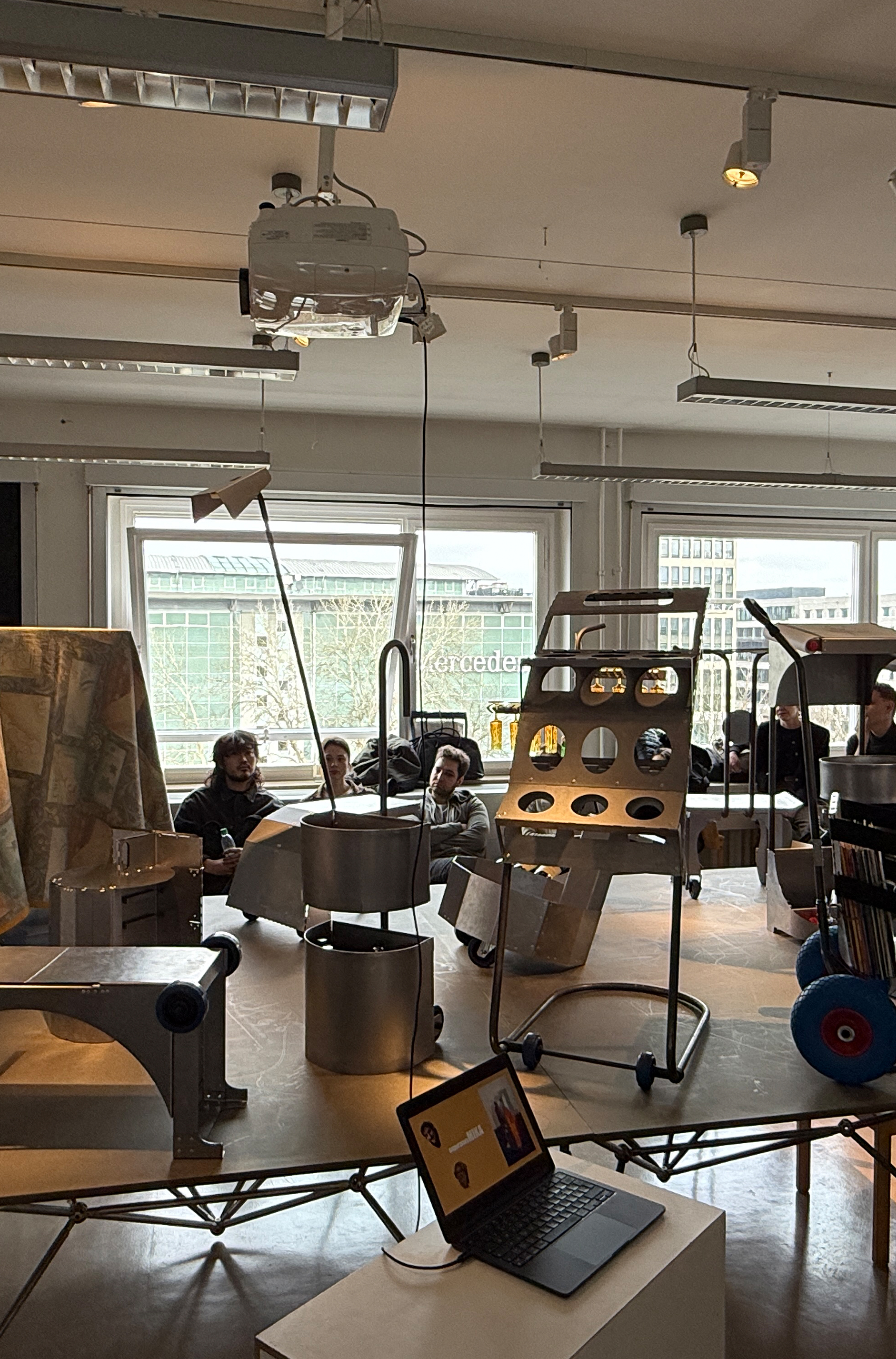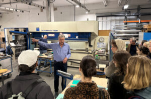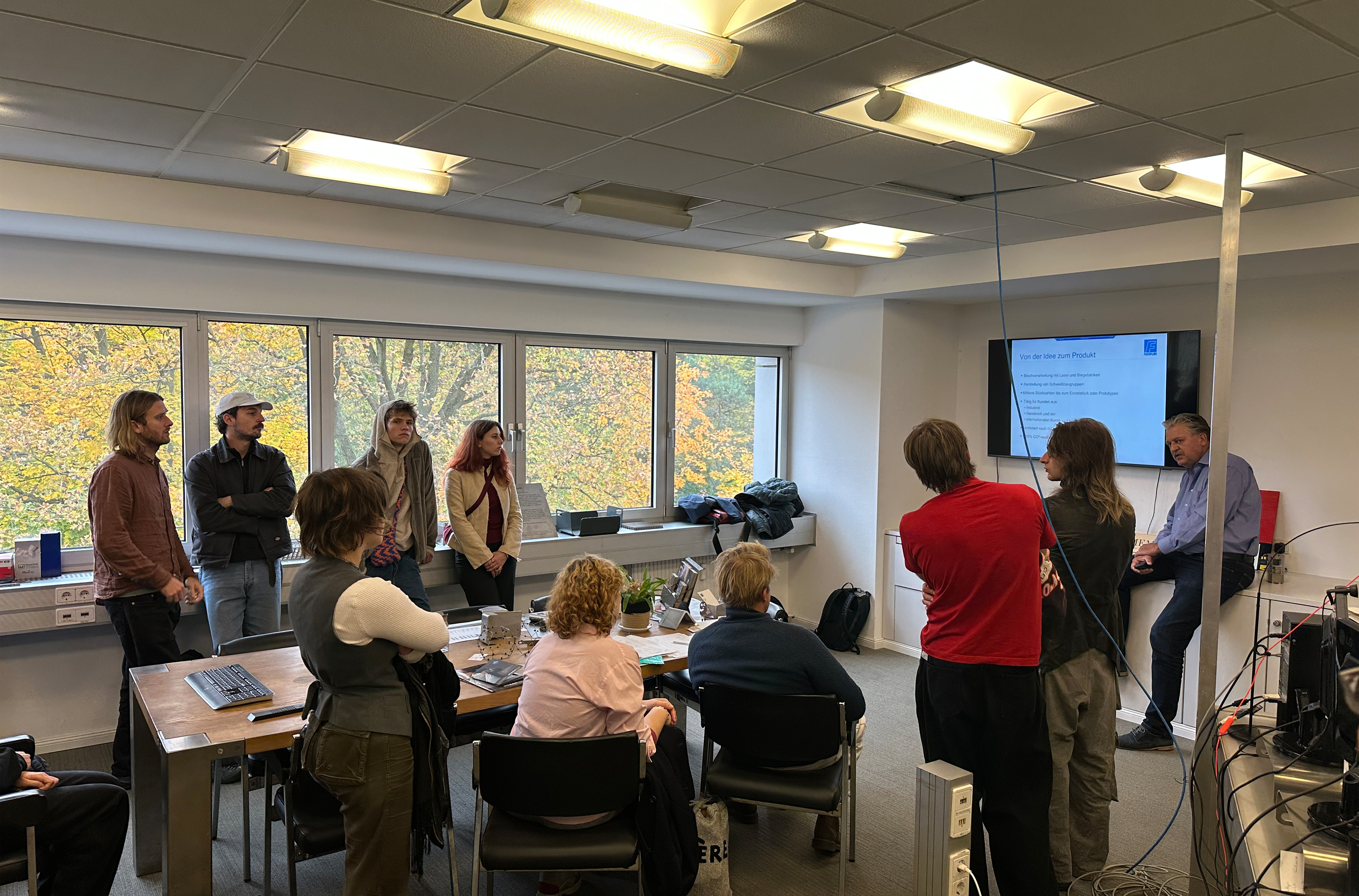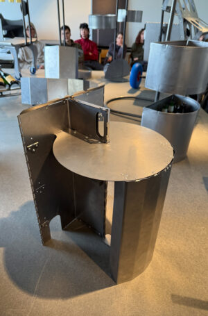 Wir lernen wichtige Materialeigenschaften und Blechkonstruktionen kennen und anwenden. Insbesondere Aussteifungen und Verbindungen. Blindnieten und verschiedene Laschungen werden als Verbindungstechnik eingesetzt. Unterstützt werden wir durch den Konstruktions-Experten Malte Licht (www.oxyd-gmbh.de). Wichtigstes Arbeitsmittel für euch wird der Bau von 1:1 Modellen aus Pappe sein. Im späteren Verlauf können diese bei Bedarf auf dem Schneidlaser in R405 als exakte Modelle hergestellt werden. Ziel ist letztendlich, eine 2D-Abwicklung zu entwerfen, aus der alle notwendigen Bauteile gekantet werden. Die Abwicklung wird noch vor Weihnachten in Solidworks in eine 2D CAD-Datei übertragen. Für den gesamten Prozess ist die frühzeitige Übertragung in ein CAD Modell sehr wichtig, deshalb ist die Teilnahme am CAD-Begleitkurs bei Anna Windrich (Mittwoch 10:00-12:45 Uhr) verpflichtend.