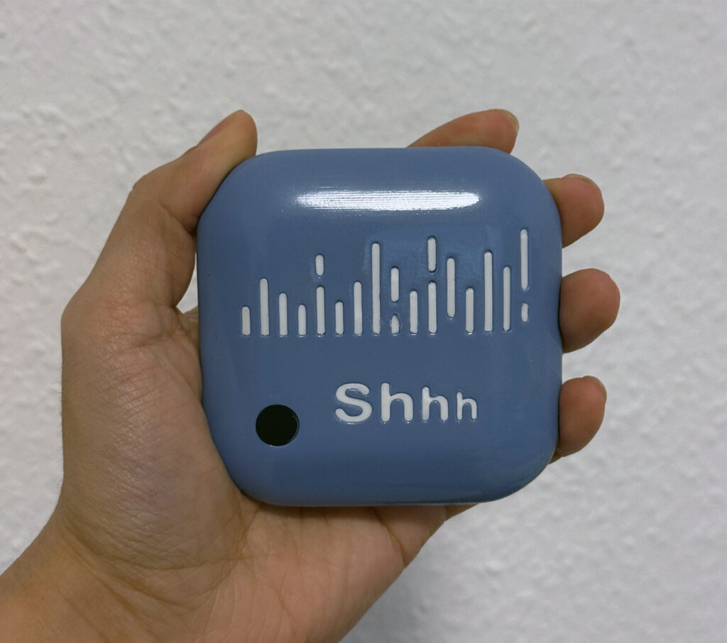Shhh ist ein Gerät zur Kontrolle der Lautstärke in sozialen Umgebungen. Es erkennt Umgebungsgeräusche und gibt visuelles Feedback durch aufleuchtende Lichter, die bei zunehmender Lautstärke heller werden. So fördert es die Selbstregulierung. Shhh verbessert gemeinsame Räume wie Wohnungen, Restaurants und Bibliotheken, indem es unnötigen Lärm reduziert und eine angenehmere Atmosphäre schafft.