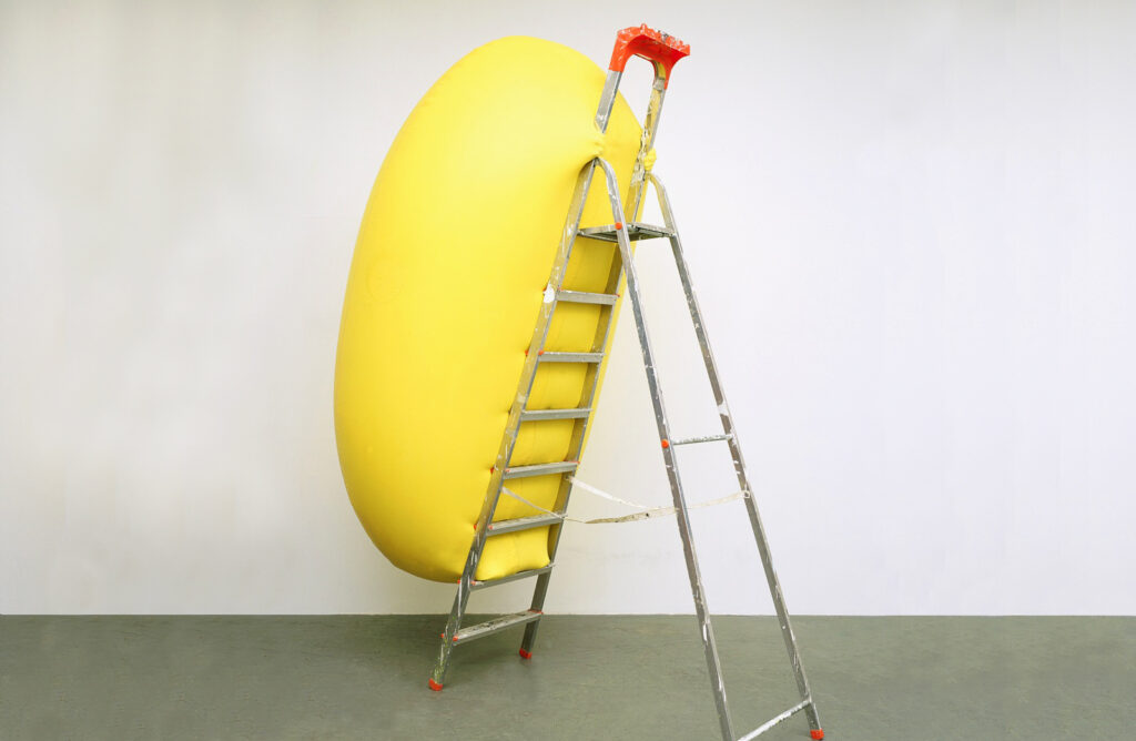 Abbildung © Hans Hemmert, (yellow sculpture fitting to ladder), 1998, latexballoon/ air/ artist/ ladder