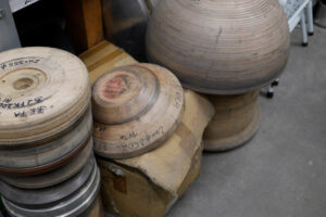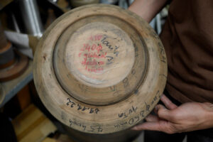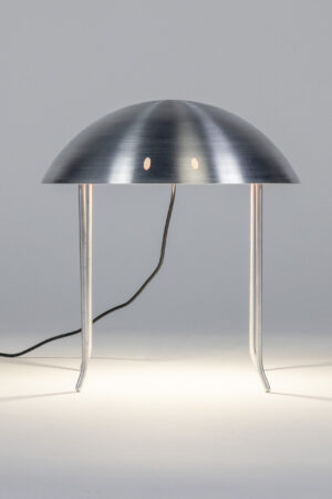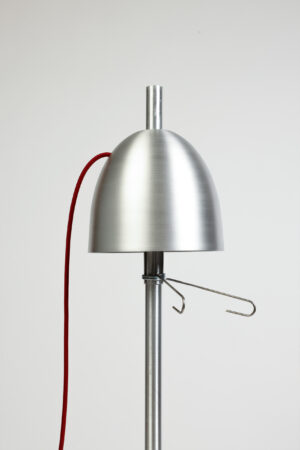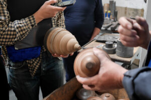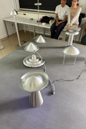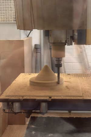 Der Leuchtenkopf wird als Reflektor auf eine bestehende Sockelleuchte aufgesetzt. Diese dient als Readymade, wodurch sich der konstruktive Aufwand für euch reduziert: Alle nötigen Komponenten – Befestigung, Fassung, Diffusor, Kabelführung sowie Montageelemente für Boden oder Wand – sind bereits vorhanden. So könnt ihr euch ganz auf den Entwurf und die Umsetzung eures Leuchtenkörpers konzentrieren. Zur Fertigung benötigt unser Kooperationspartner eine Holzform, die ihr selbst herstellt. Sie bildet das Positiv, über das das Metall gedrückt wird. Die Form kann entweder auf unserer 5-Achs-Fräse nach CAD-Daten produziert oder von Hand an der Drechselbank gefertigt werden. Die Holzformen müssen von uns nach Dresden transportiert oder versendet werden. Dort wird dann das Drehteil aus Aluminium gefertigt.