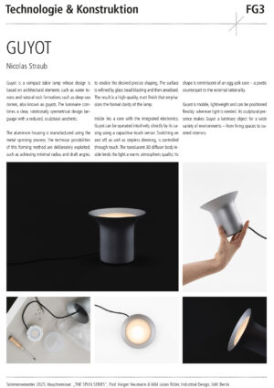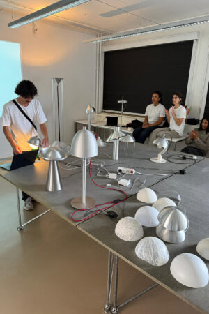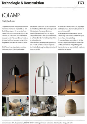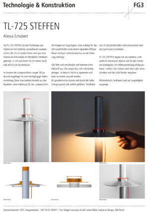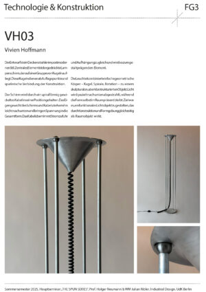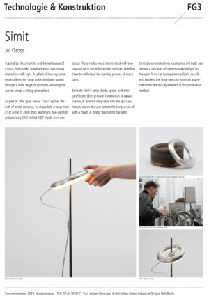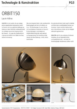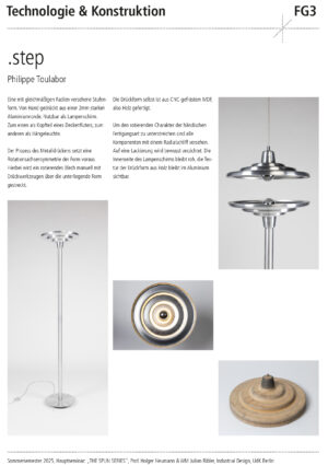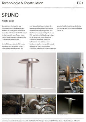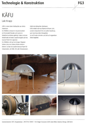 Entwurf, Konstruktion und Fertigung eines individuellen Leuchtenkopfs in Form eines Rotationskörpers, der nach Maßgabe des Drück-Verfahrens umsetzbar ist – also ohne Hinterschnitte und unter Berücksichtigung der notwendigen Spannvorrichtung. Innerhalb dieses Rahmens soll eine gestalterisch eigenständige, konzeptionell durchdachte Form entstehen.