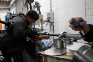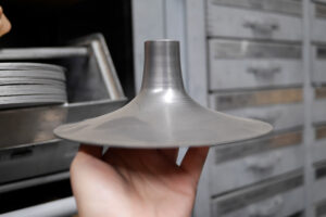 Metalldrücken ist eine hoch-interessante Fertigungstechnologie, bei der eine flache Metallronde durch rotierende Verformung über eine Holz- oder Metallform gedrückt wird. Die Methode erlaubt es, mit vergleichsweise einfachem Werkzeugaufwand stabile, rotationssymmetrische Hohlkörper zu erzeugen. Die Technologie eignet sich sehr gut für Klein- und Mittelserien.