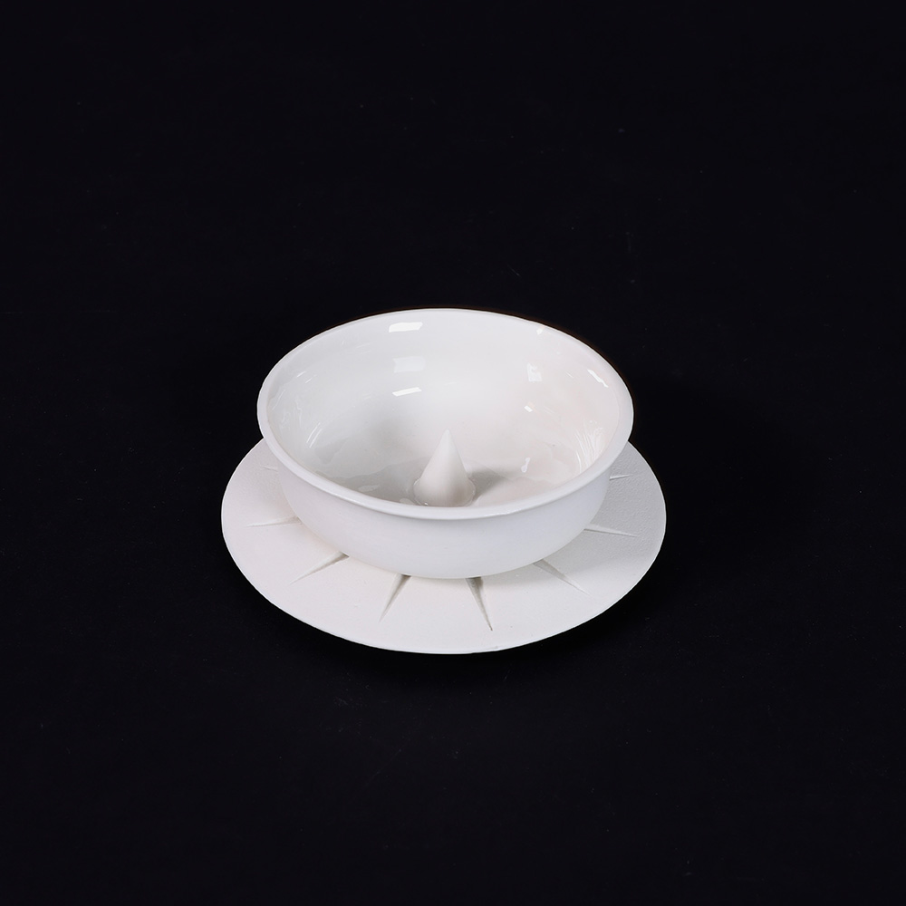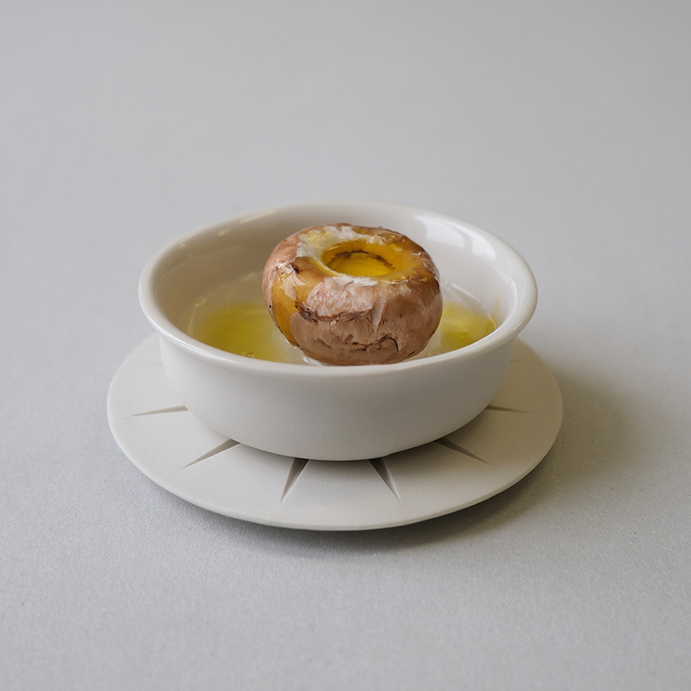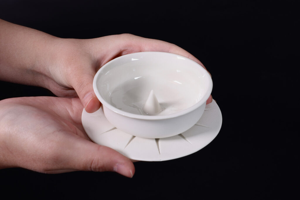 FUNGEN explores a future beverage culture based on fungi in response to climate change. Using thin porcelain and an integrated Fungpin, the cup transforms pouring water into a ritual. Mushroom-derived oil rises to the surface, stimulating the