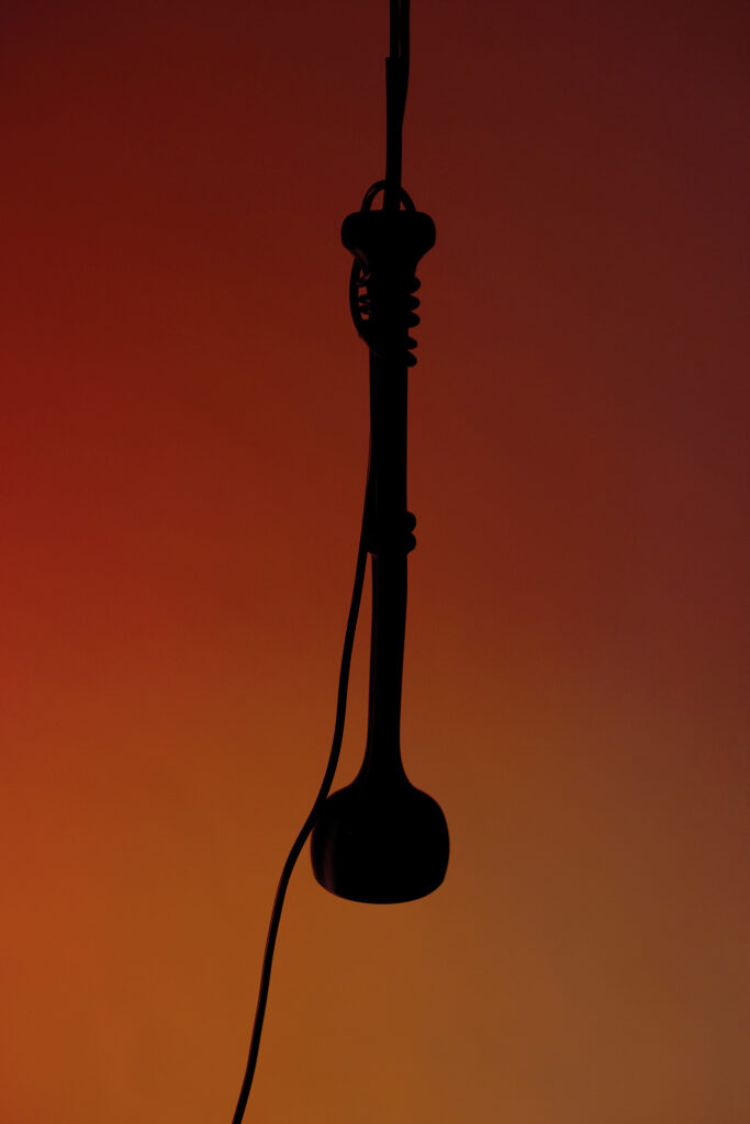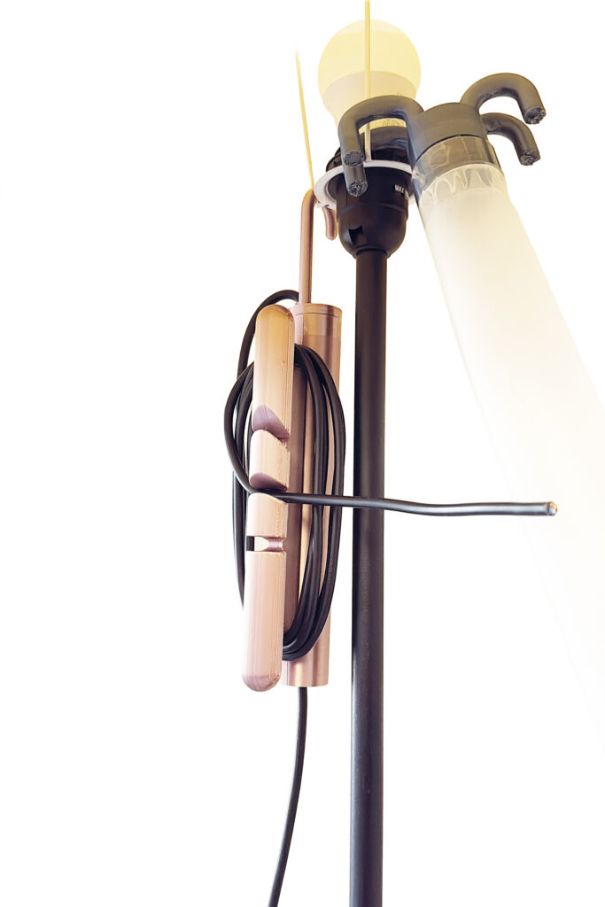 As a deliberate counterproposal to portable battery-powered lights, the design rejects technical autonomy and instead positions the cable as the central design element. The cable structures reach, movement, and return, making the connection to infrastructure visible rather than concealing it.