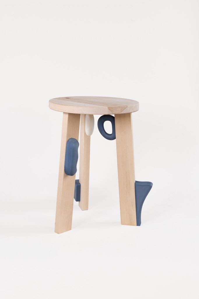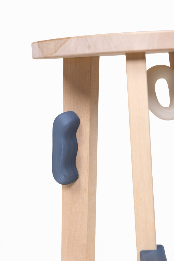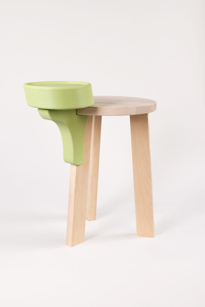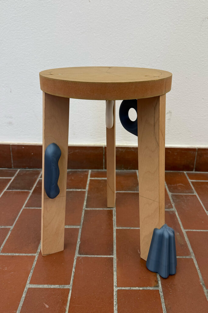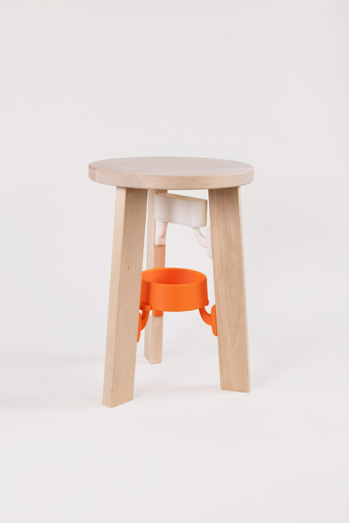 On the Stool beginnt mit einem einfachen dreibeinigen Holz-Stool, das durch 3D-gedruckte Add-ons ergänzt wird. Der Kontrast zwischen natürlichem Holz und farbigem Kunststoff erzeugt eine klare visuelle Spannung.
