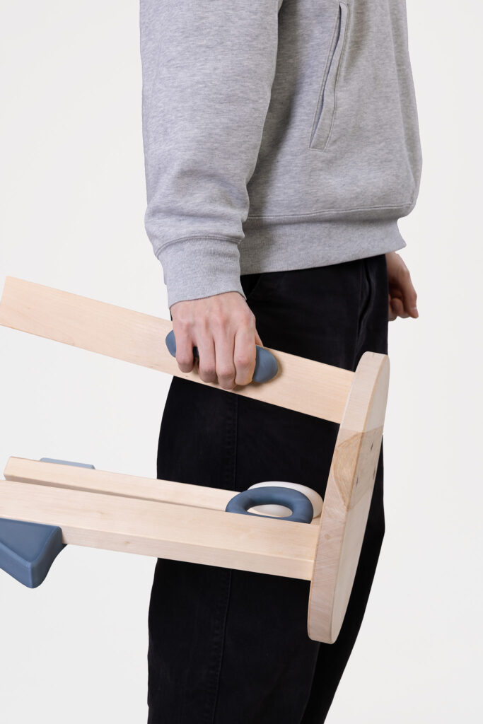 Drei Varianten Carry-On, Baby-On und Grab-On reagieren auf unterschiedliche Situationen wie Atelier, Familie und Bibliothek und ermöglichen die Nutzung des Stools in verschiedenen alltäglichen Kontexten.