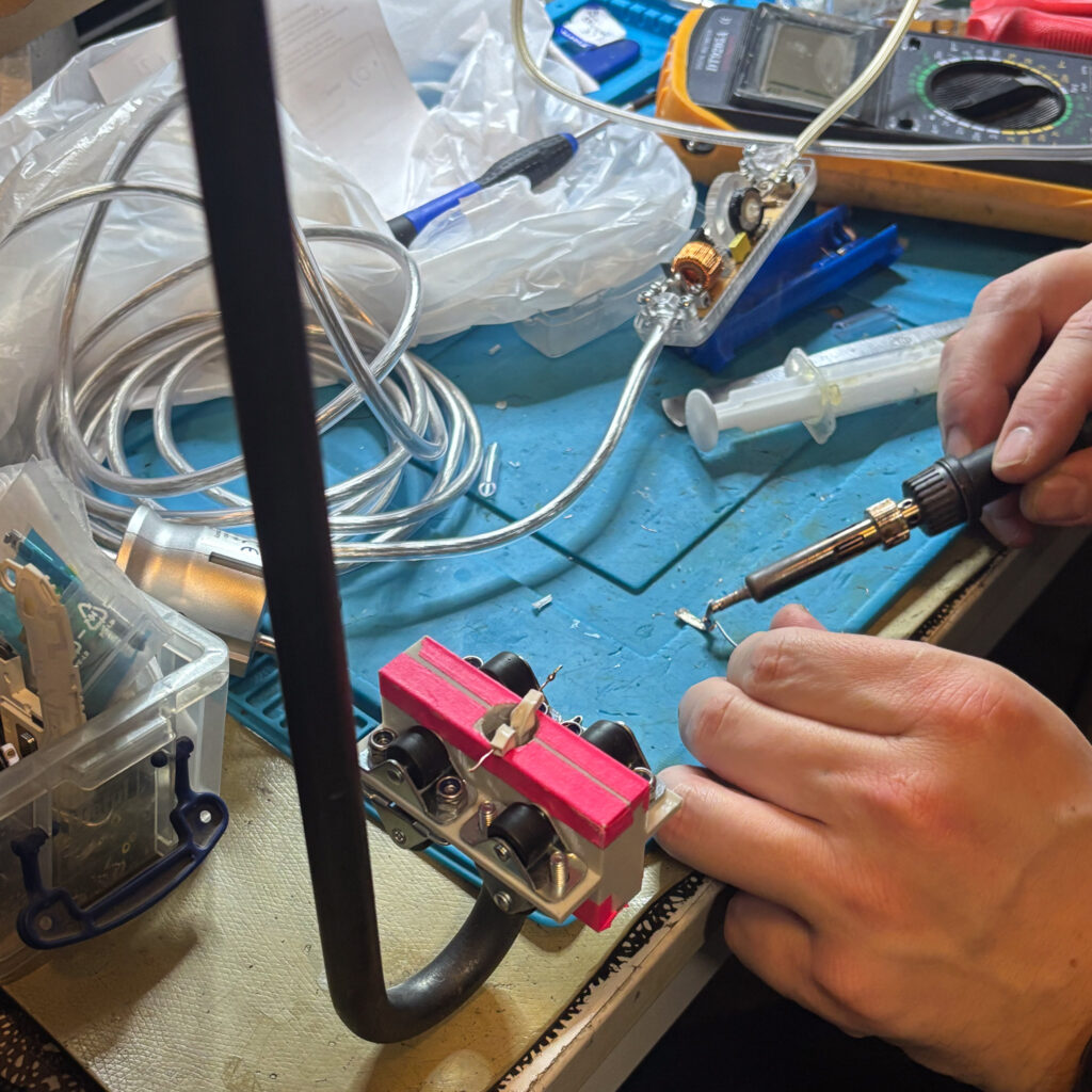 Das Projekt übersetzt das Prinzip der Deckenstromschiene in den Arbeitsraum und macht Licht als bewegliches, sinnliches Element erfahrbar. Die Leuchte reagiert auf menschliche Handlung und begleitet Arbeitsprozesse flexibel. Als ergänzendes System zur Erco-Deckenschiene bringt TRK-01 Licht auf Tischhöhe. Eine zweigeteilte Schiene aus Mechanik- und Stromebene ermöglicht sichere, reibungsarme Bewegung und kontinuierliche Stromversorgung.