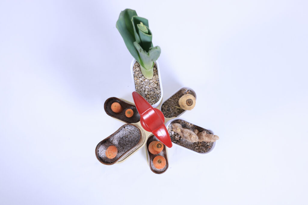 Knolle is a modular storage system for root vegetables. It transforms the act of storing into a ritual of growing and harvesting, encouraging users to engage more consciously with root vegetables. The system offers two modes. In its first form, a single modular element functions as a „vase replacement“ on the dining table, presenting vegetables, especially carrots, as an accessible snack. In its second form, multiple modular elements are combined to create a storage solution for root vegetables in the kitchen.
