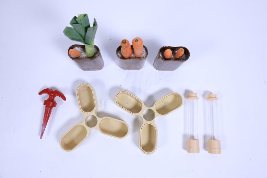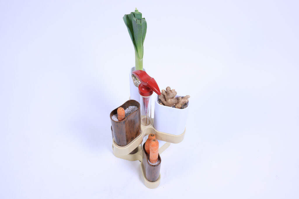 Knolle ist ein modulares Aufbewahrungssystem für Wurzelgemüse. Es transformiert den Prozess des Lagerns in ein Ritual des Anbauens und Ernten, und lässt den Nutzenden bewusster mit Wurzelgemüse umgehen. Das System bietet außerdem 2 Zustände. Einmal in Form eines modularen Elements als „Vasenersatz“ auf dem Esstisch. Hier ist es ein System, das Gemuse, besonders Karotten, als Snack anbietet. Die andere Form besteht aus mehre-ren modularen Elementen und dient als Lagerungsort für Wurzelgemüse in der Küche.