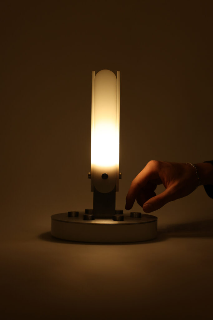 The Madeleine table lamp explores the abdication of object autonomy. In a world saturated with services designed to anticipate our every need, Madeleine remains deliberately silent until a collective intent is manifested. This ‚collective enactment‘ transforms light from mere utility into a relational mediator : a shared temporal frame for the inhabitation of a common habitat.