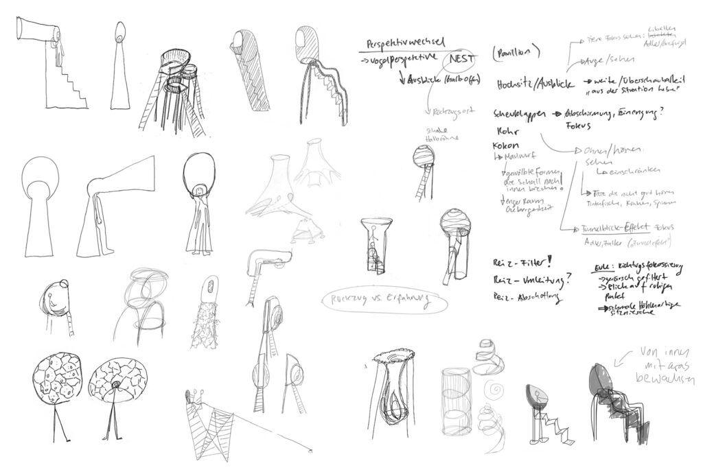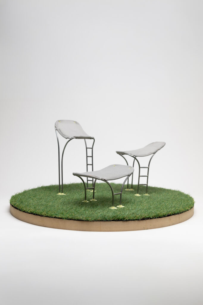 PAUSE ist eine mikroarchitektonische Outdoorliege, die Orte für mentale Erholung im urbanen Raum schafft. Durch die horizontale Körperposition ermöglicht sie einen Perspektivwechsel, der Distanz zum städtischen Trubel schafft und zur Entschleunigung beiträgt. Gleichzeitig fungiert die Konstruktion als schattenspendendes Element und reagiert auf klimatische Herausforderungen. In drei Varianten bietet das Objekt unterschiedliche Grade von Hohe, Zuganglichkeit und Wahrnehmung, als „dritter Ort“ fur kurze Pausen im Alltag.