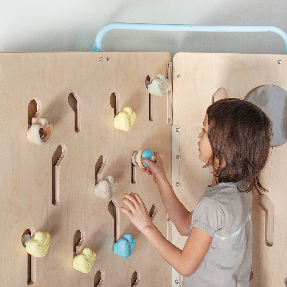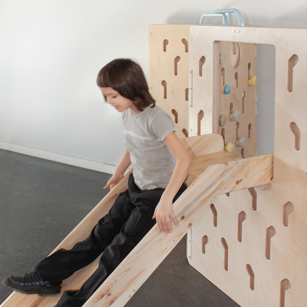 ReRoute Play Wall is a modular, foldable bouldering wall system designed for indoor kindergarten spaces. It addresses the limited adaptability of many existing bouldering walls, which often fail to accommodate mixed-age groups. Children can reposition holds, adjust the level of difficulty, and create their own routes and games. When not in use, the wall folds away to free up space for other activities.