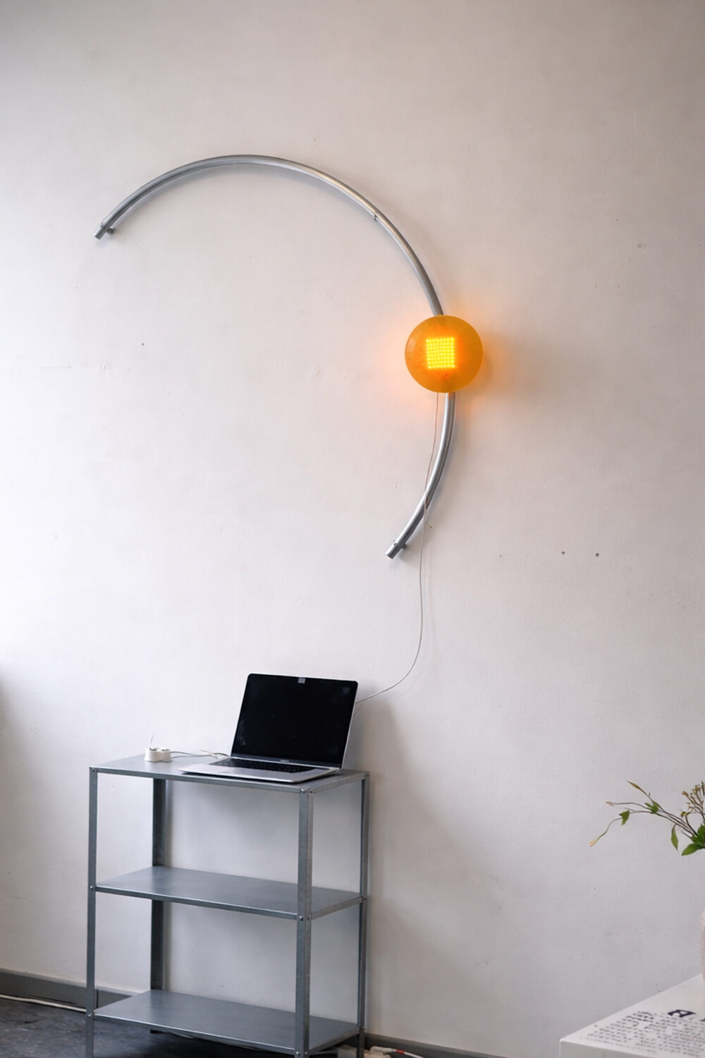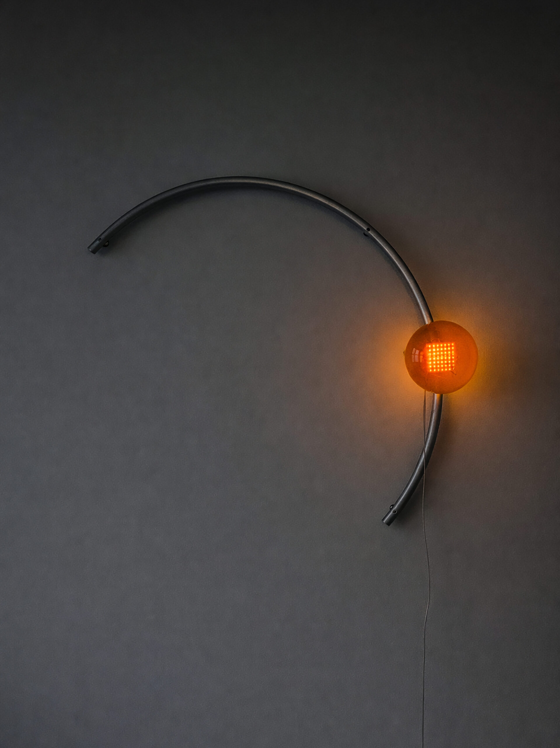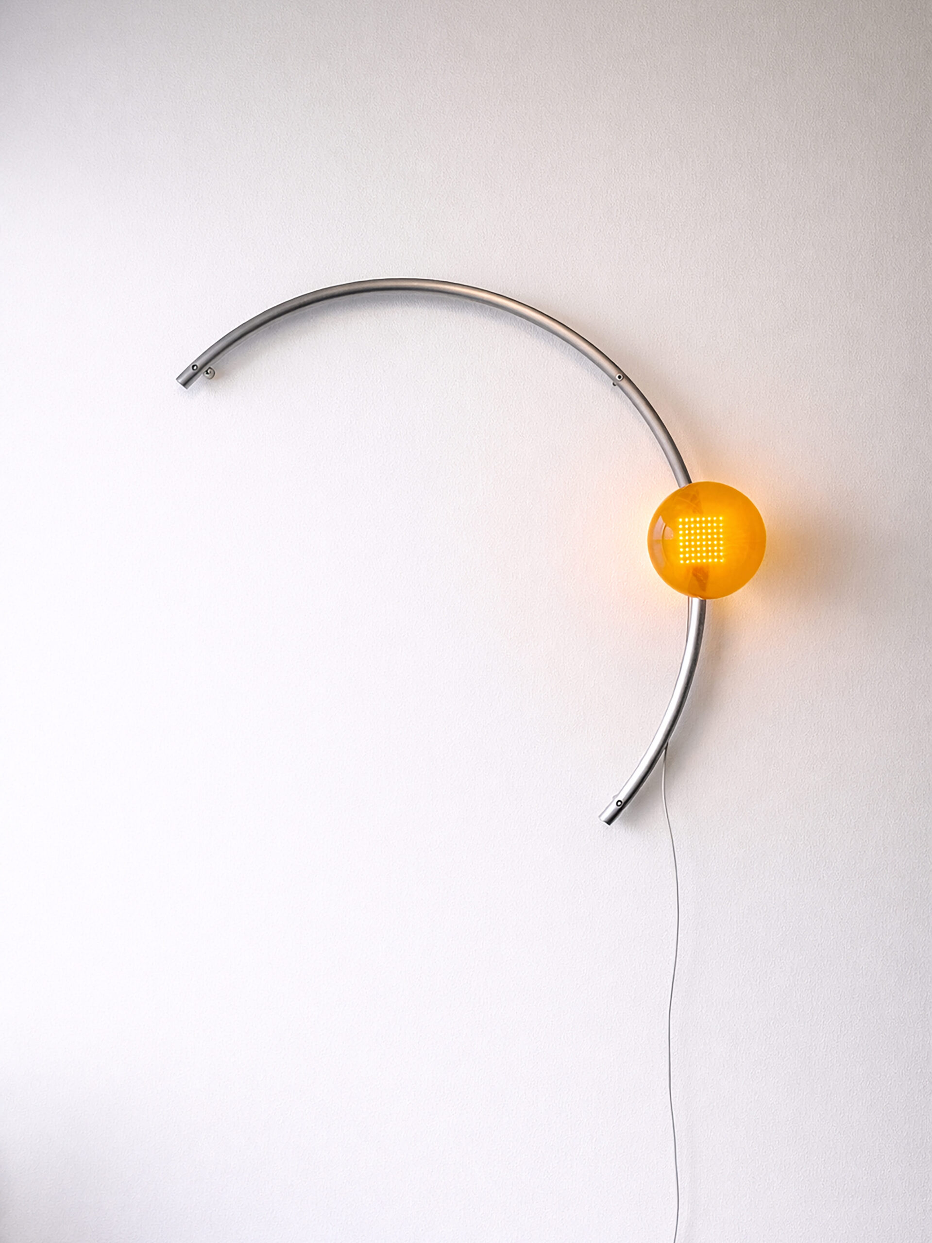 Inspiriert vom zirkadischen Rhythmus des menschlichen Körpers, folgt Rhythmus dem natürlichen Lauf der Sonne. Eine Lampe gleitet auf einer halbkreisförmigen Schiene – an der Wand montiert – langsam auf und ab. Wie die Sonne am Horizont beschreibt sie ihren täglichen Bogen. Sie erinnert uns daran, den Tag bewusst zu nutzen – und rechtzeitig loszulassen.