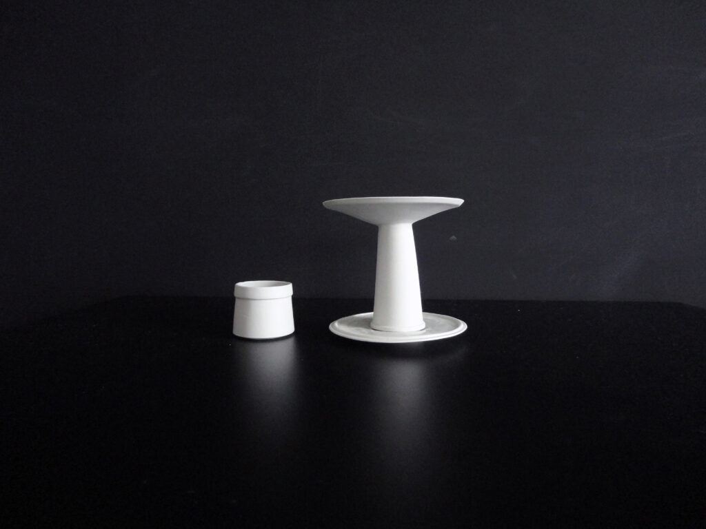 TO is poured from lightly grey coloured porcellan. This process of production allows precice results which is important since the three party of the teaobject need to be stacked on top each other.