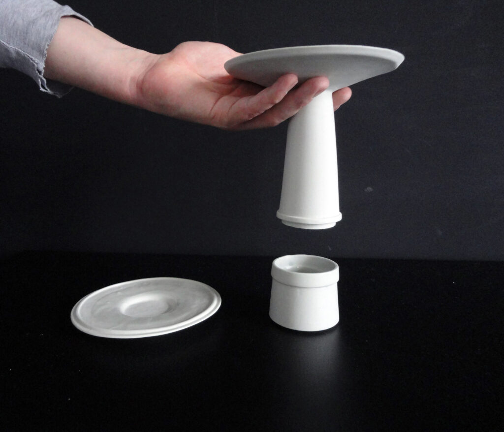 TO wird gegossen aus leicht grau gefärbtem Porzellan. Mit dieser Produktionsmethoden erreicht man die präzisesten Ergebnisse. Dies ist sehr wichtig, da die einzelnen Teile des Teeobjektes in einander passen müssen.