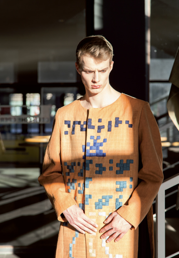 Der westafrikanische Boubou, Festtags-, aber auch Alltagsgewand, majestätisch und schlicht zugleich, bildet die Grundlage der Kollektionsidee und verschmilzt mit Vorstellungen von praktischer sowie festlicher Herrenkleidung, die wir als westlich betrachten. Stickereien, Prints und Farbgebung greifen Interpretationsversuche auf, die Bedeutungen von Mustern in Bezug auf ihre zu bestimmen.