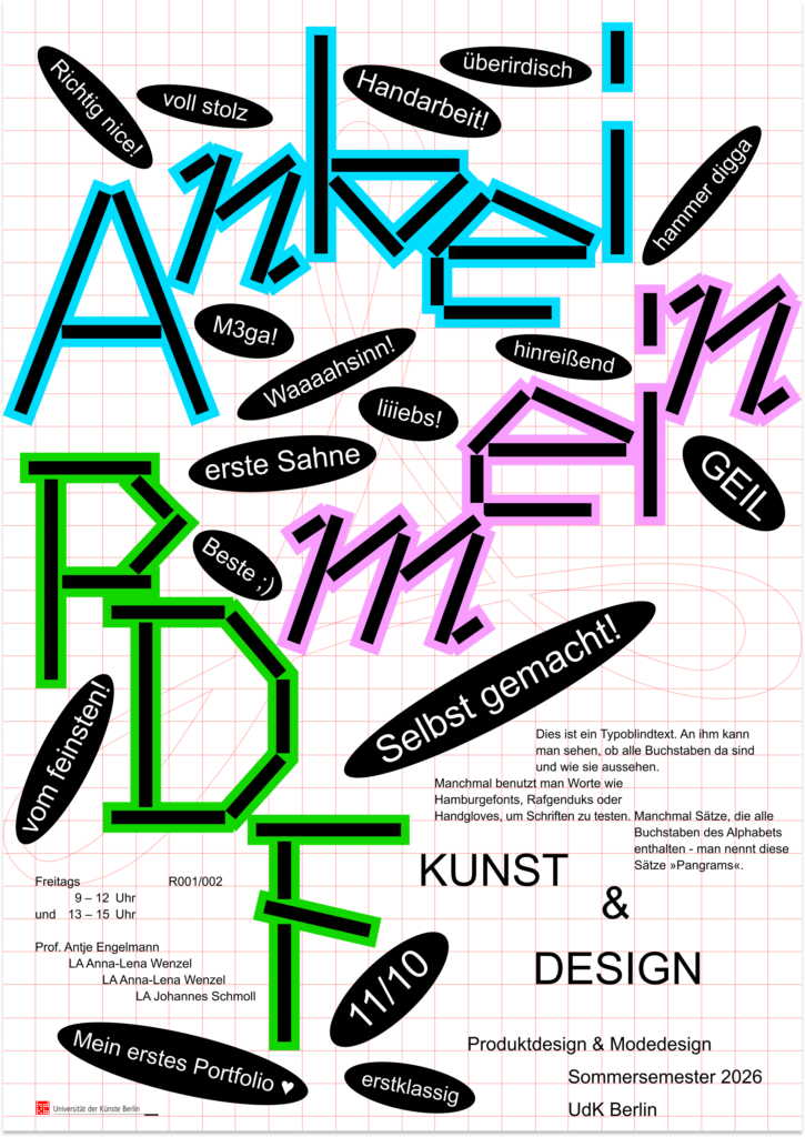 Parallel dazu wird Sprache als zweites Gestaltungsmittel begriffen. Unter Anleitung von Anna-Lena Wenzel entwickeln die Studierenden Texte für das Portfolio. Ein wesentlicher Teil des Lernprozesses ist die professionelle Selbstdarstellung. In Gruppenarbeiten und Feedbackrunden mit Professorin Antje Engelmann und Hanna Halstenberg wird das Sprechen über die eigene Arbeit sowie die künstlerische Haltung und gestalterische Identität trainiert. Ziel des Kurses ist die Erstellung eines Portfolios mit mindestens fünf Projekten auf zirka 20 Seiten inklusive eines Artist Statements und einer Kurzbiografie.