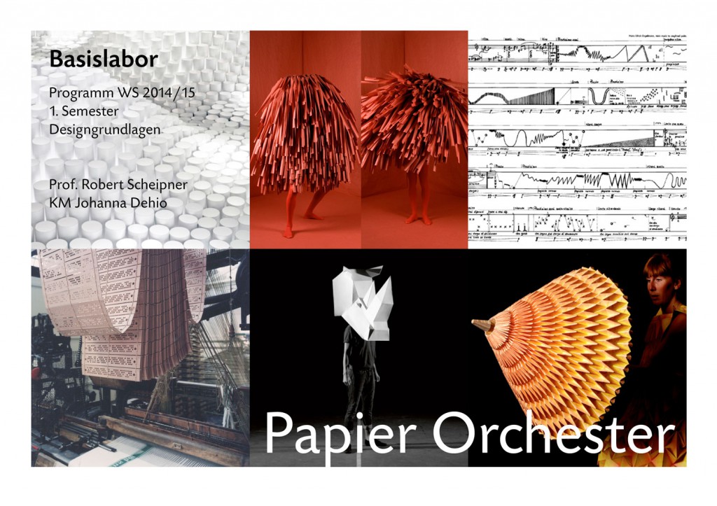Im Mittelpunkt steht die Einführung, Entdeckung und Aneignung des Entwurfes als dialogischer Prozeß, über die Entwicklung eines Erfahrungsfeldes (Recherche, Experiment, Variantenbildung), differenzierte Selektion (Kriterienbildung, Entscheidungsfähigkeit) und die beginnende Ausbildung artikulierter Kompetenz (Diskurs, Reflexion, Darstellung). Angeregt, erfrischt, produktiv irritiert und komplementiert wird das Semester durch „Impulse” – zweistündige Ultrakurzprojekte. Am Ende mündet alles in einer Gesamtperformance – dem Papier Konzert.