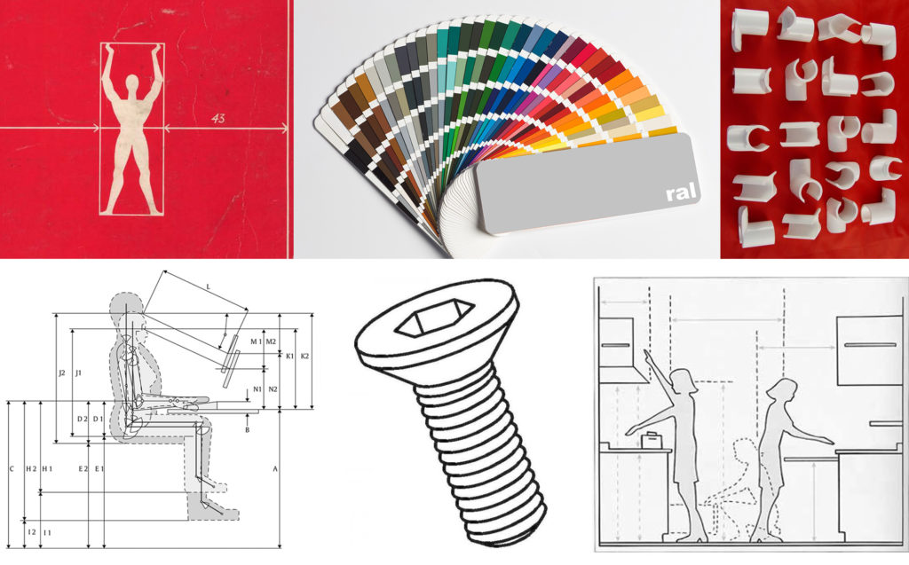 standards in wood, metal, plastics / standard components for furniture / standard colours / standards for pricing / standards for drawings / standard sizes for kitchens and offices / various heights, angles and depths for furniture.