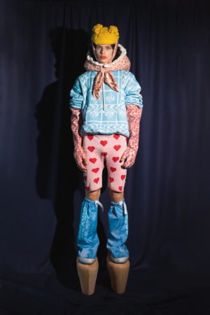 Throughout history, an ideal body has developed that people have not been able to distance themselves from for a long time. People who do not fit into this perfect image are prisoners in their body, which is not perceived as perfect by society. The hoodie serves as protection and a place of retreat from contemptuous looks and comments. Dealing with this subject has led me to develop a distorted perception of the body. Between stigmatized classical beauty, a sculptural figure develops that distorts/deconstructs the body as it is known and is meant to bring it into new dimensions. A play between space and body emerges that both relate to the body and distances itself from it. By modifying the silhouette, a positive reference is drawn to inequalities that are inherent in everybody.By creating a manifestation, the viewer is encouraged to distance himself from the „normal“ ideal image. The wearer must turn away from familiar body shapes in his appearance, which creates a stadium between sculpture and human being. They should feel comfortable and fade out the reduction to society’s ideal image.
